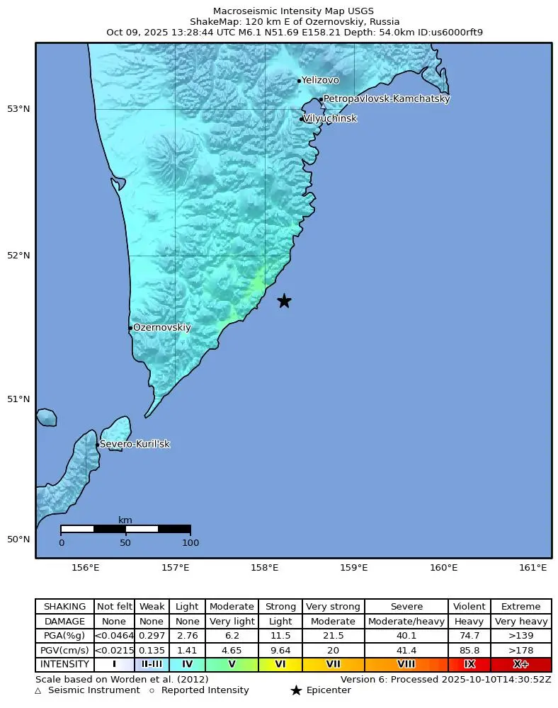 Shake map for M 6.1 - 120 km E of Ozernovskiy, Russia showing shaking intensity and report locations around the epicenter.