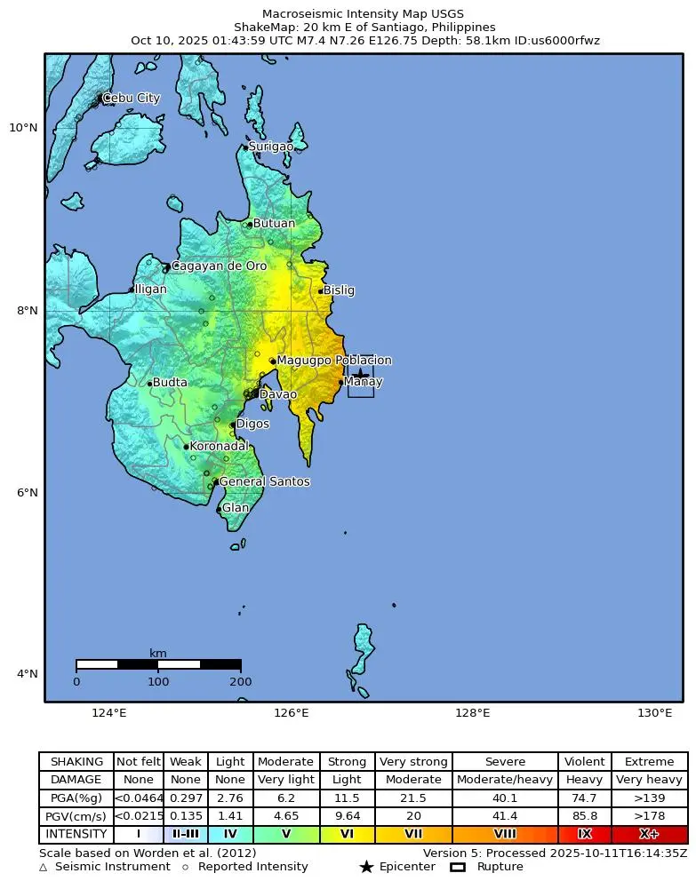 The October 10, 2025, M 7.4 earthquake off the east coast of the island of Mindanao, Philippines occurred as a result of oblique reverse faulting. Focal mechanism solutions indicate that rupture occurred on either a moderately-dipping, south-southeast striking reverse fault with a component of left-lateral strike-slip or a moderately-dipping northeast striking reverse fault with a component of right-lateral strike-slip. At the location of the earthquake, the Philippine Sea plate subducts west-northwest with respect to the Sunda plate at a velocity of approximately 100 mm/yr.